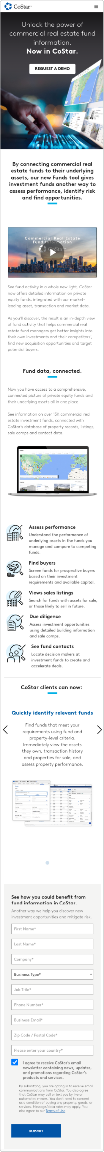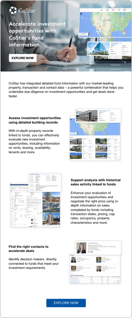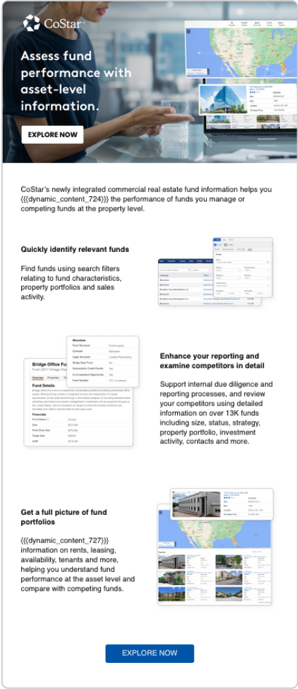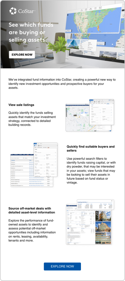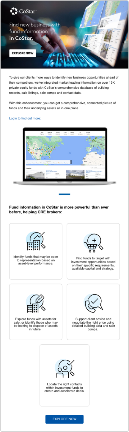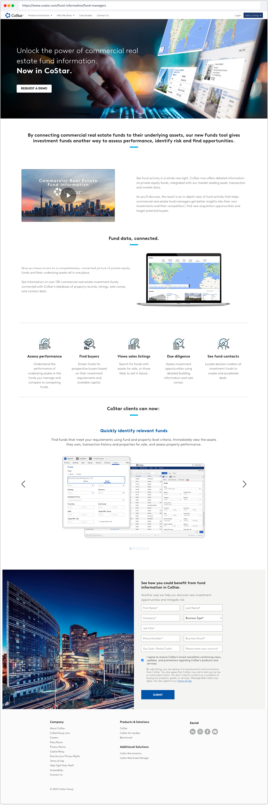 I led a multi-channel campaign to launch CoStar’s new Funds Information feature, which links commercial real estate funds to their underlying assets. Using display ads, email, and responsive landing pages, we highlighted how the tool helps funds assess performance, spot risks, and uncover opportunities — taking audiences smoothly from awareness to conversion. It went on to be our top-performing campaign of 2024.